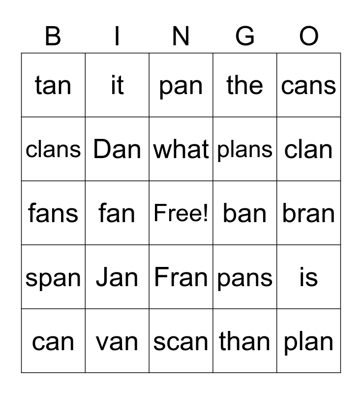 This bingo card has a free space and 29 words: can, man, fan, ran, tan, pan, Dan, Jan, ban, van, bran, plan, scan, than, clan, gran, Fran, span, cans, fans, pans, vans, plans, clans, the, it, is, what and my.