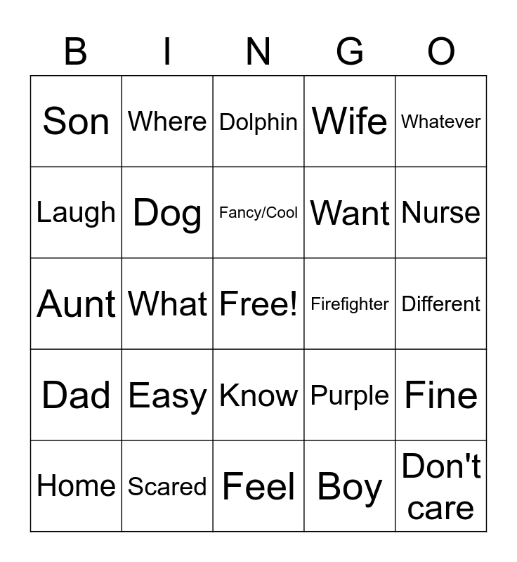 This bingo card has a free space and 142 words: Red, Orange, Yellow, Green, Blue, Purple, Pink, Brown, Black, White, Grey, Color, Sign, Language, Deaf, Hearing, Yes, No, Please, Sorry, Thank you, Fine, Paper, Fingerspell, Who, What, Where, When, Why, Which, How, How much, Same, Different, Have, Need, Like, Don't like, Want, Don't want, Understand, Don't understand, Know, Don't know, Do, Again, Help, Good, Bad, Favorite/Prefer, Important, Go, Home, Bathroom, Eat/Food, Water, Man, Woman, Person, People, Girl, Boy, Friend, Family, Mom, Dad, Brother, Sister, Grandma, Grandpa, Daughter, Son, Aunt, Uncle, Cousin, Niece, Nephew, Husband, Wife, Children, Baby, Student, Teacher, Doctor, Nurse, Police, Firefighter, Emotion, Feel, Happy, Excited, Mad, Sad, Scared, Confused, Surprised, Bored, Tired, Worried, Sick, Laugh, Cry, Oh-I-See, Wow, Fancy/Cool, Cute, Sweet, Right, Fun, Easy, Hard, Poor thing/Pity, Whatever, Don't care, Animal, Dog, Cat, Fish, Rabbit, Bird, Turtle, Frog, Snake, Horse, Cow, Pig, Sheep, Bear, Wolf, Deer, Squirrel, Mouse/Rat, Elephant, Giraffe, Lion, Tiger, Shark, Dolphin, Whale, Name, Number and Birthday.