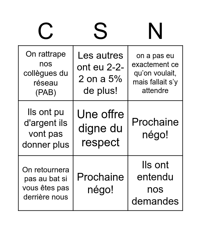 This bingo card has a free space and 9 words: On retournera pas au bat si vous êtes pas derrière nous, on a pas eu exactement ce qu’on voulait, mais fallait s’y attendre, Les autres ont eu 2-2-2 on a 5% de plus!, Ils ont pu d'argent ils vont pas donner plus, On rattrape nos collègues du réseau (PAB), Prochaine négo!, Ils ont entendu nos demandes, Ça a pris 2 ans avoir cette offre on aura pas mieux! and Prochaine négo!.
