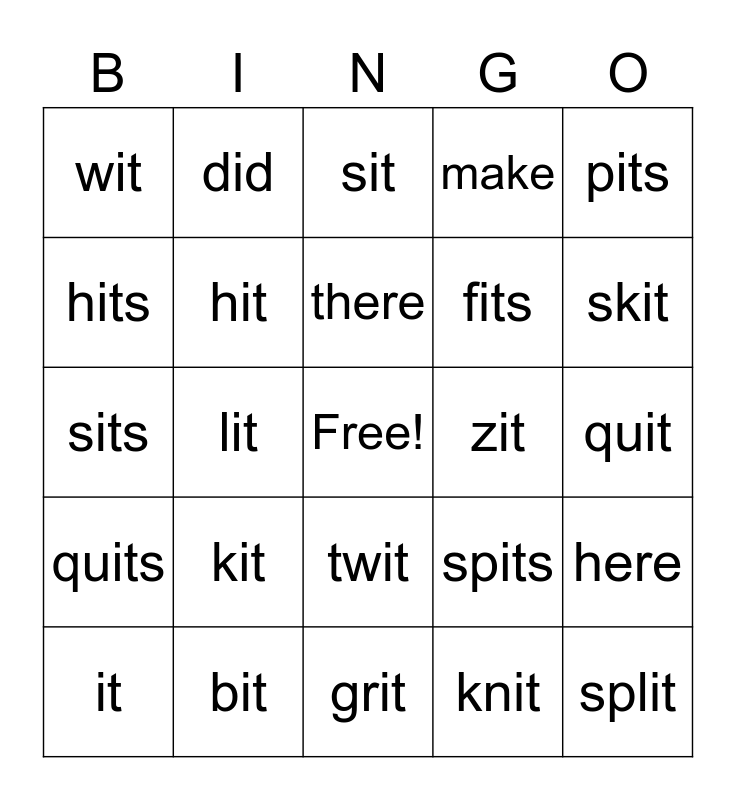This bingo card has a free space and 29 words: it, spit, lit, fit, wit, sit, hit, kit, zit, bit, quit, split, grit, knit, skit, pit, twit, quits, pits, sits, spits, lits, fits, hits, make, did, here, there and went.