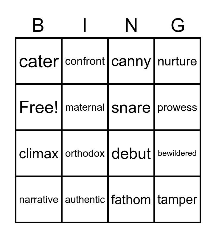 This bingo card has 16 words: authentic, bewildered, canny, cater, climax, confront, debut, fathom, Free!, maternal, narrative, nurture, orthodox, prowess, snare and tamper.