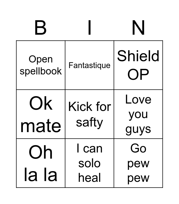 This bingo card has 9 words: Oh la la, Shield OP, Fantastique, Ok mate, Open spellbook, Love you guys, Kick for safty, Go pew pew and I can solo heal.