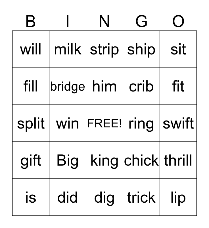 This bingo card has a free space and 24 words: Big, did, him, is, sit, will, fill, milk, ring, king, crib, split, chick, thrill, bridge, trick, swift, strip, fit, win, lip, gift, ship and dig.