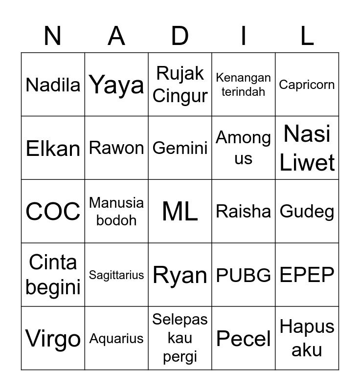 This bingo card has a free space and 24 words: Sagittarius, Aquarius, Gemini, Virgo, Capricorn, Nadila, Elkan, Yaya, Raisha, Ryan, Among us, COC, PUBG, EPEP, Rawon, Pecel, Gudeg, Rujak Cingur, Nasi Liwet, Manusia bodoh, Hapus aku, Cinta begini, Kenangan terindah and Selepas kau pergi.