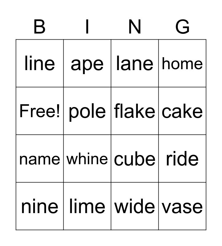 This bingo card has 16 words: lime, ride, lane, line, name, ape, cube, wide, Free!, pole, nine, home, whine, cake, flake and vase.