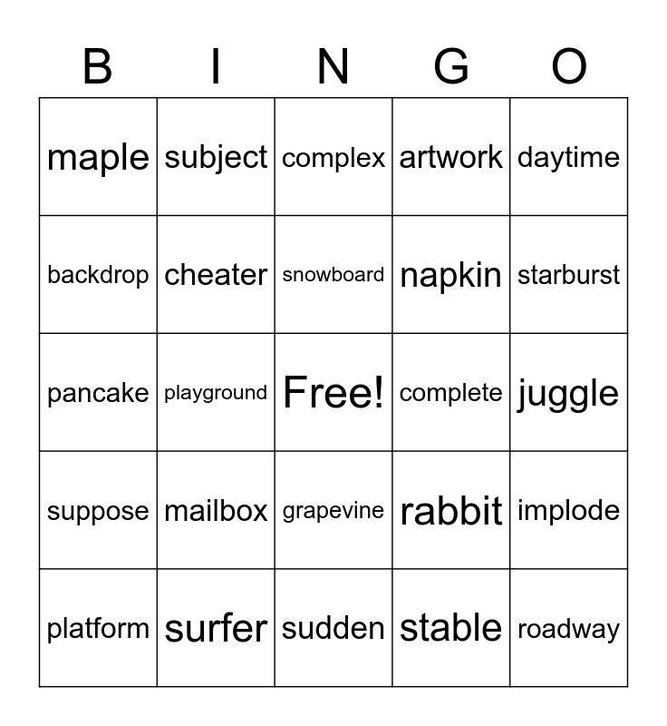 This bingo card has a free space and 27 words: rabbit, picnic, napkin, sudden, backdrop, complex, subject, suppose, complete, implode, pancake, artwork, platform, surfer, starburst, sustain, cheater, snowboard, mailbox, maple, juggle, stable, playground, roadway, grapevine, daytime and whiplash.