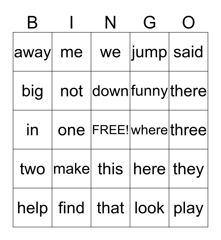 This bingo card has a free space and 24 words: make, find, down, help, said, away, big, me, where, this, funny, in, here, they, not, look, three, we, there, one, play, two, jump and that.