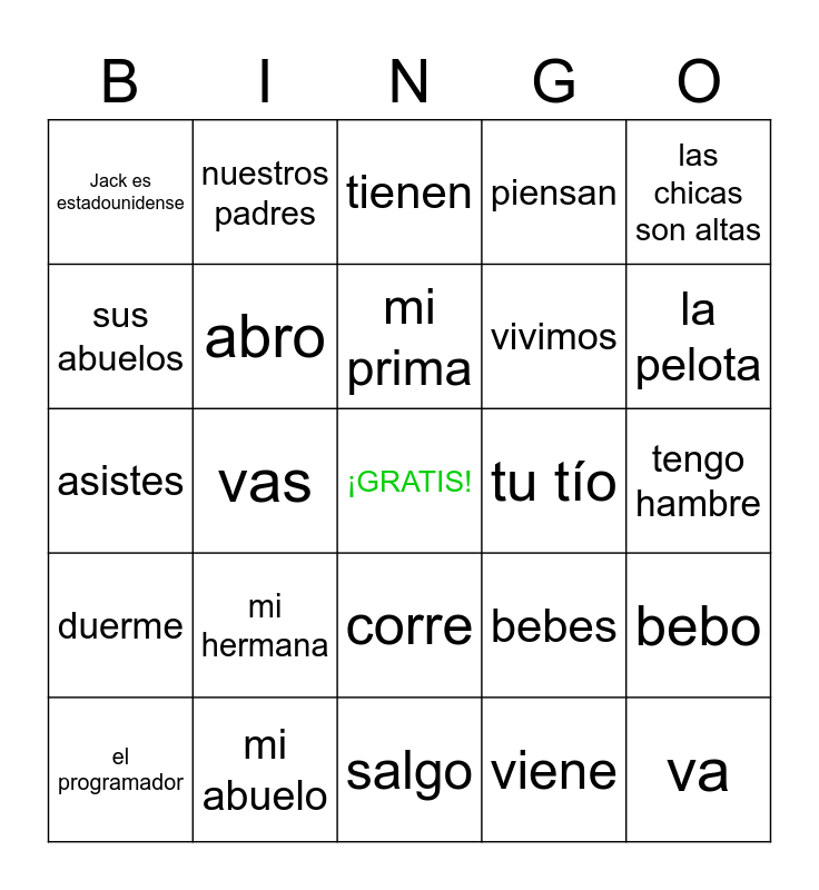 This bingo card has a free space and 24 words: mi hermana, mi abuelo, mi prima, el programador, las chicas son altas, Jack es estadounidense, sus abuelos, nuestros padres, tu tío, corre, vivimos, asistes, bebes, bebo, abro, viene, tengo hambre, tienen, la pelota, vas, va, duerme, piensan and salgo.