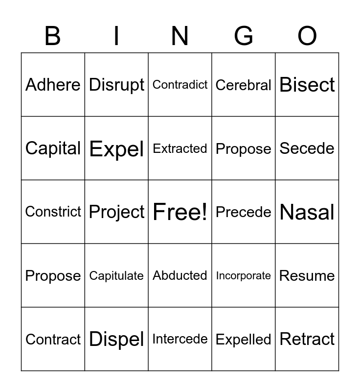 This bingo card has a free space and 33 words: Revoke, Manual, Project, Aural, Propose, Expel, Bisect, Contract, Disrupt, Manuscript, Extracted, Contradict, Habitat, Induct, Precede, Secede, Dispel, Constrict, Capitulate, Incorporate, Abducted, Avert, Adhere, Nasal, Intercede, Retract, Cerebral, Propose, Capital, Resume, Retraction, Expelled and Depose.