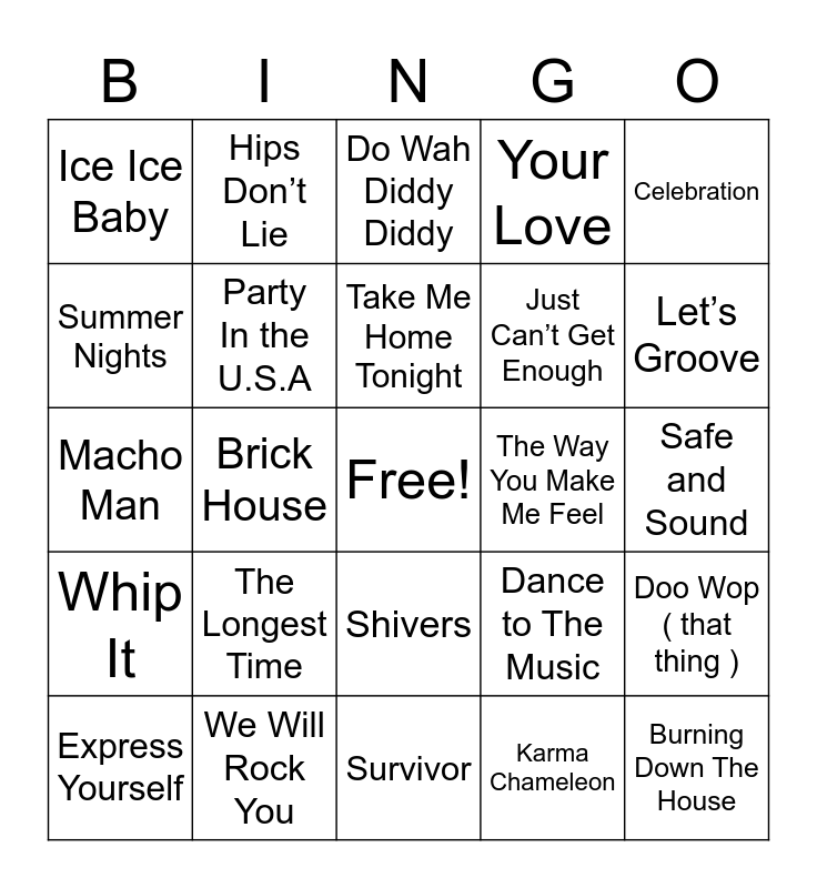 This bingo card has a free space and 73 words: I’m Gonna Be (500 miles ), Jump Around, Ice Ice Baby, What I Like About You, Low Rider, Why Can’t We Be Friends, Whip It, My Sharona, Dance to The Music, Should I Stay Or Should I Go, Cheerleader, All Right Now, Party In the U.S.A, Safe and Sound, Lido Shuffle, Hips Don’t Lie, Survivor, Summer Nights, Hot Hot Hot, The Way You Make Me Feel, Take Me Home Tonight, Your Love, Celebration, Pump Up The Jam, Express Yourself, Weatherman, The Rubberband Man, Faithfully, That’s the way ( I Like It ), Rich Girl, We Will Rock You, Movin Out ( Anthony’s Song), Alright, Fun, Fun, Fun (mono), Brick House, I can’t help Myself ( sugar pie,honey bunch ), Walk The Dinosaur, Boogie Fever, Burning Down The House, Our House, Karma Chameleon, The Longest Time, Barbie Girl, C’est la Vie, All Star, Just Can’t Get Enough, Do Wah Diddy Diddy, Summer Of ‘69, Don’t Worry Be Happy, Macho Man, Gonna Make You Sweat (Everybody Dance Now), Thank God I’m a Country Boy, She’s a Lady, Yakety Yak, And We Danced, Do Ya Think I’m Sexy?, It’s Gonna Be Me, Shivers, Shout It out Loud, 4 minutes, Take on Me, The Way You Look Tonight, Tennessee Whisky, Let’s Groove, Waterloo, Pour Some Sugar On Me, Raspberry Beret, Higher Love, Doo Wop ( that thing ), Mr. Big Stuff, You Are the Best Thing, Emotions and Do You Believe In Love.