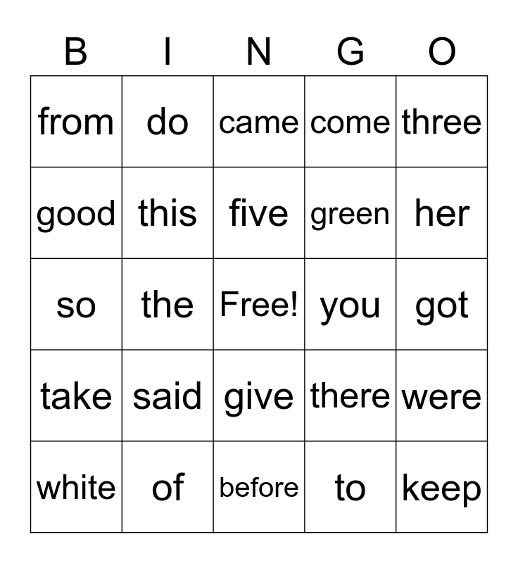 This bingo card has a free space and 36 words: with, have, one, this, there, take, five, by, three, are, the, come, he, you, her, from, thing, said, keep, came, got, were, of, white, before, do, so, be, green, good, ate, make, to, give, here and put.