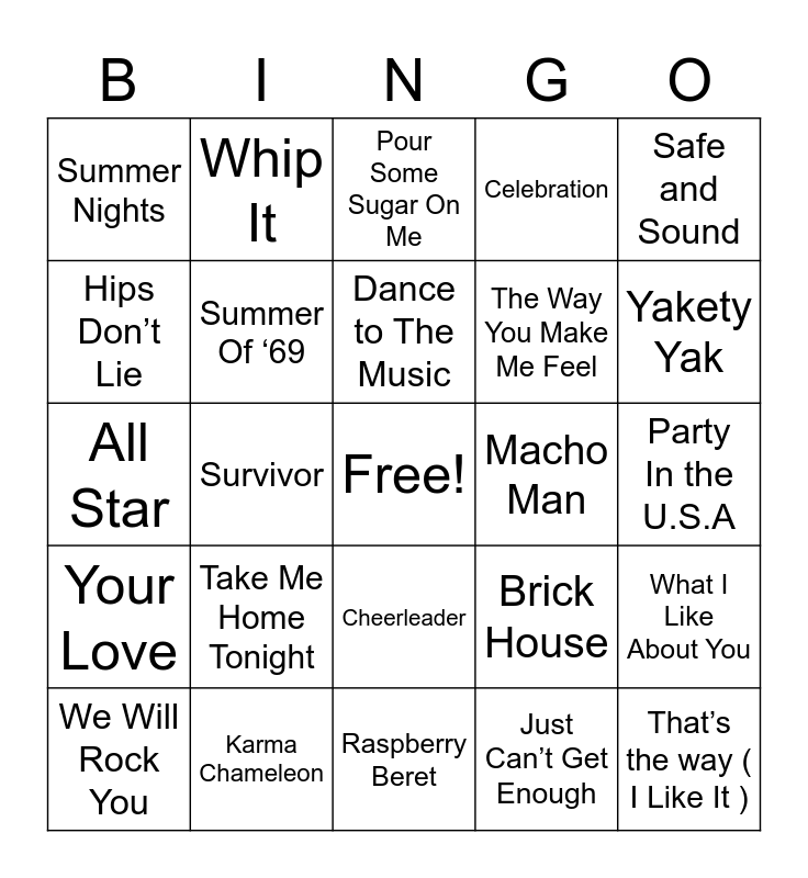 This bingo card has a free space and 66 words: I’m Gonna Be (500 miles ), Jump Around, Ice Ice Baby, What I Like About You, Low Rider, Why Can’t We Be Friends, Whip It, My Sharona, Dance to The Music, Should I Stay Or Should I Go, Cheerleader, All Right Now, Party In the U.S.A, Safe and Sound, Lido Shuffle, Hips Don’t Lie, Survivor, Summer Nights, Hot Hot Hot, The Way You Make Me Feel, Take Me Home Tonight, Your Love, Celebration, Pump Up The Jam, Express Yourself, Weatherman, The Rubberband Man, Faithfully, That’s the way ( I Like It ), Rich Girl, We Will Rock You, Movin Out ( Anthony’s Song), Alright, Fun, Fun, Fun (mono), Brick House, Karma Chameleon, The Longest Time, All Star, Just Can’t Get Enough, Do Wah Diddy Diddy, Summer Of ‘69, Don’t Worry Be Happy, Macho Man, Gonna Make You Sweat (Everybody Dance Now), Thank God I’m a Country Boy, She’s a Lady, Yakety Yak, And We Danced, Do Ya Think I’m Sexy?, It’s Gonna Be Me, Shivers, Shout It out Loud, 4 minutes, Take on Me, The Way You Look Tonight, Tennessee Whisky, Let’s Groove, Waterloo, Pour Some Sugar On Me, Raspberry Beret, Higher Love, Doo Wop ( that thing ), Mr. Big Stuff, You Are the Best Thing, Emotions and Do You Believe In Love.