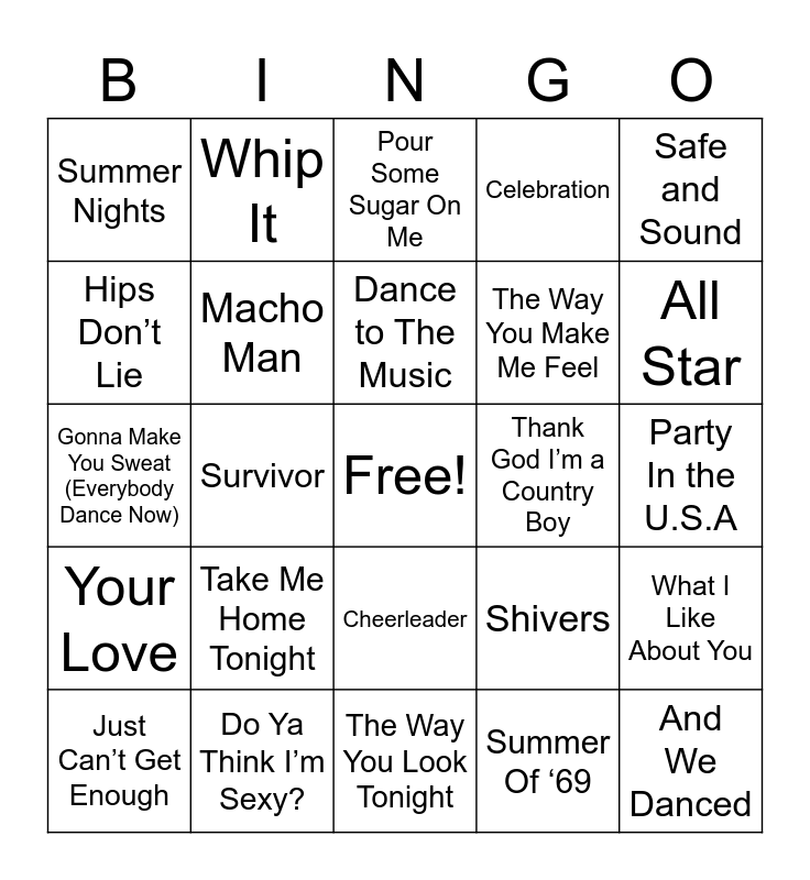 This bingo card has a free space and 63 words: I’m Gonna Be (500 miles ), Jump Around, Ice Ice Baby, What I Like About You, Low Rider, Why Can’t We Be Friends, Whip It, My Sharona, Dance to The Music, Should I Stay Or Should I Go, Cheerleader, All Right Now, Party In the U.S.A, Safe and Sound, Lido Shuffle, Hips Don’t Lie, Survivor, Summer Nights, Hot Hot Hot, The Way You Make Me Feel, Take Me Home Tonight, Your Love, Celebration, Pump Up The Jam, Express Yourself, Weatherman, The Rubberband Man, Faithfully, That’s the way ( I Like It ), Rich Girl, We Will Rock You, Movin Out ( Anthony’s Song), Alright, Fun, Fun, Fun (mono), All Star, Just Can’t Get Enough, Do Wah Diddy Diddy, Summer Of ‘69, Don’t Worry Be Happy, Macho Man, Gonna Make You Sweat (Everybody Dance Now), Thank God I’m a Country Boy, She’s a Lady, Yakety Yak, And We Danced, Do Ya Think I’m Sexy?, It’s Gonna Be Me, Shivers, Shout It out Loud, 4 minutes, Take on Me, The Way You Look Tonight, Tennessee Whisky, Let’s Groove, Waterloo, Pour Some Sugar On Me, Raspberry Beret, Higher Love, Doo Wop ( that thing ), Mr. Big Stuff, You Are the Best Thing, Emotions and Do You Believe In Love.