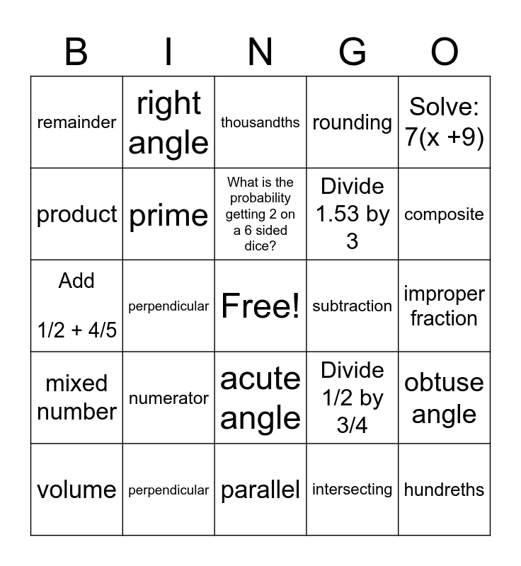 This bingo card has a free space and 24 words: numerator, perpendicular, What is the probability getting 2 on a 6 sided dice?, volume, Solve: 7(x +9), remainder, product, right angle, subtraction, acute angle, Divide 1.53 by 3, Add 1/2 + 4/5, Divide 1/2 by 3/4, obtuse angle, prime, intersecting, improper fraction, thousandths, composite, perpendicular, hundreths, mixed number, rounding and parallel.