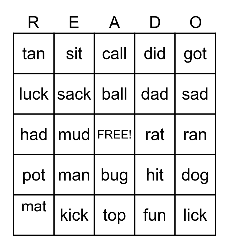 This bingo card has a free space and 24 words: man, kick, ball, mat, got, tan, luck, sit, rat, bug, dad, had, hit, dog, sack, fun, ran, call, sad, mud, lick, pot, did and top.