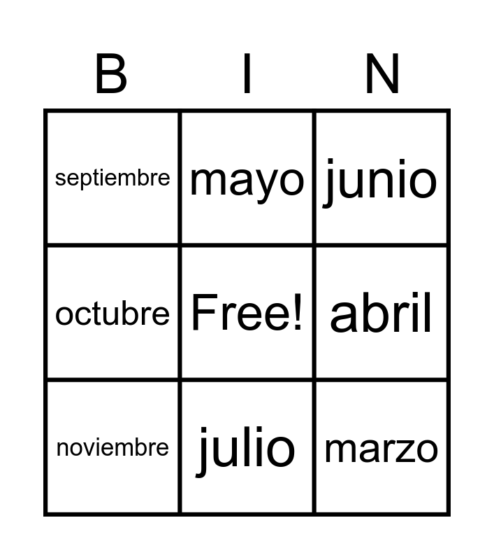 This bingo card has a free space and 12 words: enero, febrero, marzo, abril, mayo, junio, julio, agosto, septiembre, octubre, noviembre and diciembre.