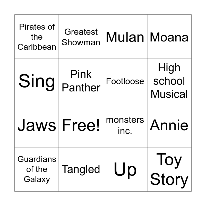 This bingo card has 16 words: Tangled, Annie, Mulan, Pirates of the Caribbean, Jaws, Greatest Showman, monsters inc., Up, Sing, Pink Panther, Guardians of the Galaxy, Moana, Free!, High school Musical, Footloose and Toy Story.