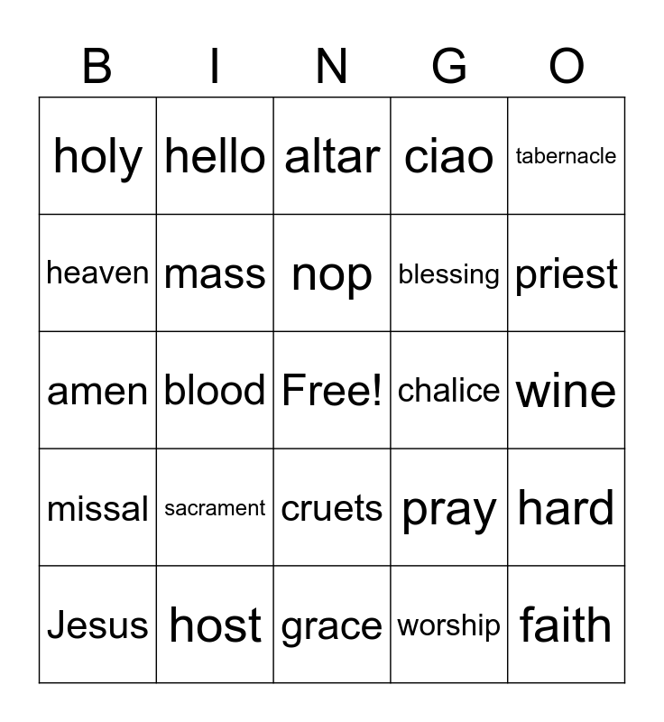 This bingo card has a free space and 29 words: Jesus, body, blood, Eucharist, holy, altar, mass, sacrament, chalice, host, wine, faith, grace, worship, priest, candles, cruets, missal, tabernacle, amen, pray, Catholics, blessing, heaven, ciao, hello, hard, nop and yes.