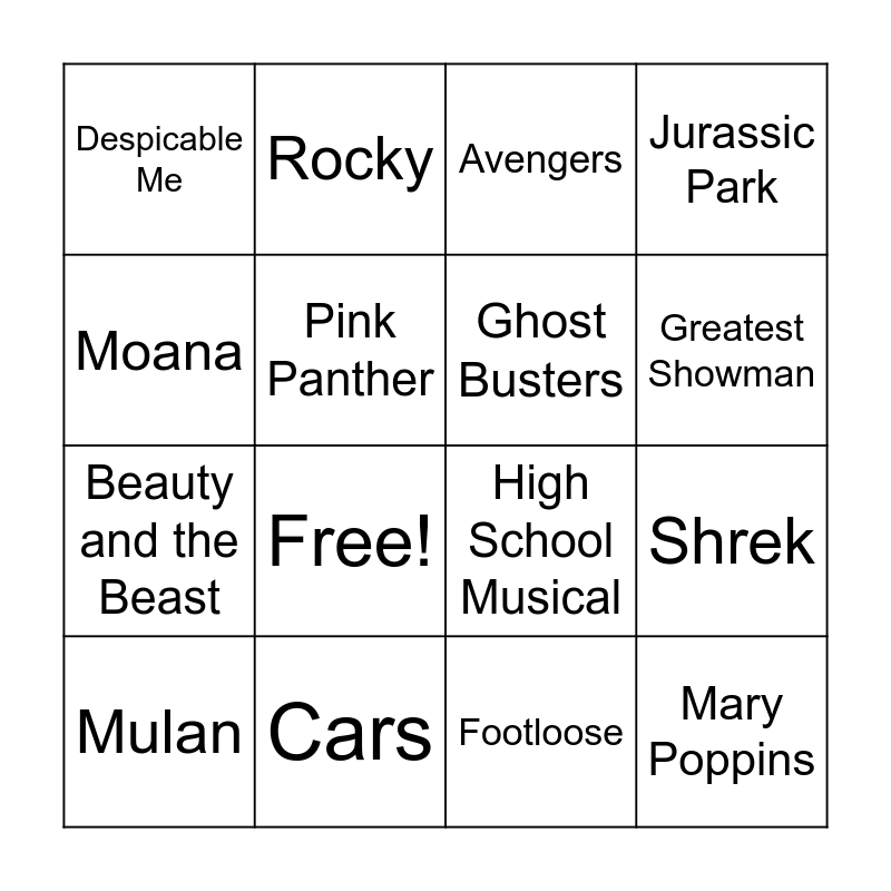 This bingo card has 16 words: Cars, Shrek, Avengers, Despicable Me, Beauty and the Beast, Rocky, High School Musical, Footloose, Moana, Pink Panther, Mulan, Jurassic Park, Free!, Greatest Showman, Ghost Busters and Mary Poppins.