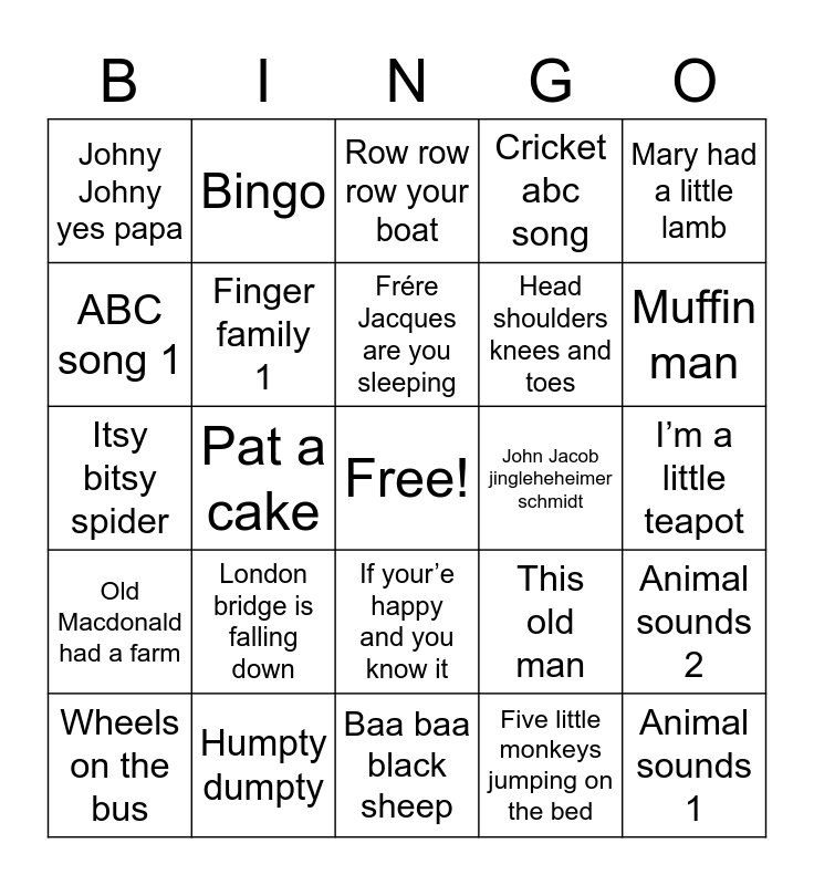 This bingo card has a free space and 29 words: Wheels on the bus, Animal fair, Pat a cake, Daisy bell, Johny Johny yes papa, Row row row your boat, Finger family 1, London bridge is falling down, John Jacob jingleheheimer schmidt, Humpty dumpty, I’m a little teapot, Animal sounds 1, Baa baa black sheep, Five little monkeys jumping on the bed, Muffin man, Hickory dickory dock, If your’e happy and you know it, Old Macdonald had a farm, Mary had a little lamb, Itsy bitsy spider, This old man, Rain rain go away, Head shoulders knees and toes, ABC song 1, Cricket abc song, Bingo, Animal sounds 2, Frére Jacques are you sleeping and 10 in the bed.