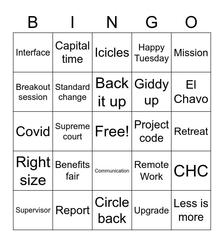 This bingo card has a free space and 25 words: Benefits fair, Circle back, Back it up, Supervisor, Mission, Interface, Breakout session, Capital time, Project code, Communication, Giddy up, Covid, Remote Work, CHC, Standard change, Leadership, Retreat, Icicles, El Chavo, Supreme court, Less is more, Report, Right size, Happy Tuesday and Upgrade.