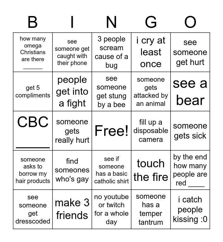 This bingo card has a free space and 24 words: find someones who's gay, make 3 friends, see someone get stung by a bee, see someone get dresscoded, see someone get hurt, how many omega Christians are there ______, get 5 compliments, see someone get caught with their phone, fill up a disposable camera, see if someone has a basic catholic shirt, someone gets attacked by an animal, CBC ____, touch the fire, by the end how many people are red ____, people get into a fight, someone has a temper tantrum, someone gets sick, 3 people scream cause of a bug, see a bear, someone gets really hurt, i catch people kissing :0, someone asks to borrow my hair products, i cry at least once and no youtube or twitch for a whole day.