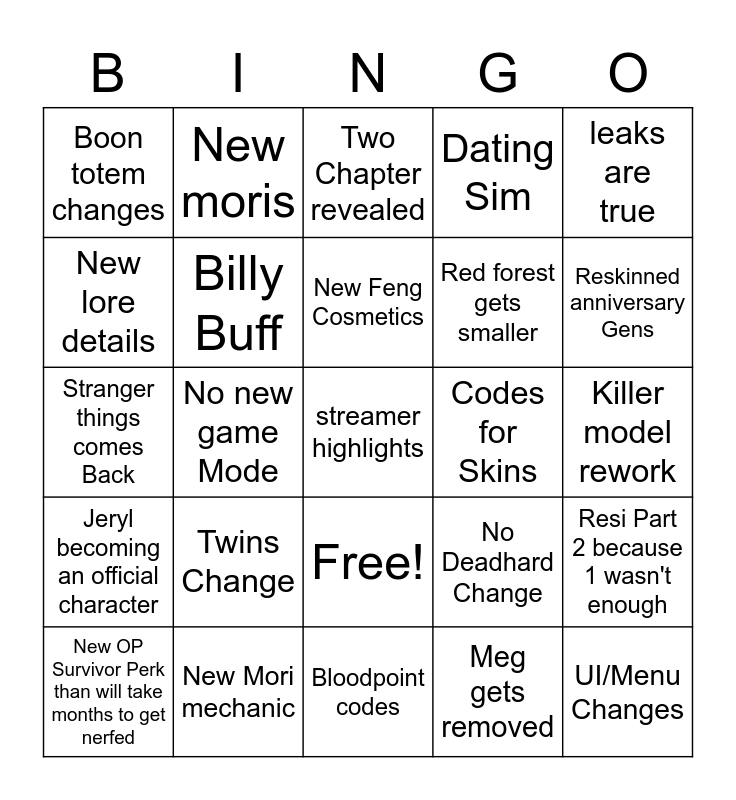 This bingo card has 26 words: Free!, Meg gets removed, New Feng Cosmetics, New Mori mechanic, leaks are true, Boon totem changes, New lore details, New moris, Killer model rework, No Deadhard Change, Red forest gets smaller, Stranger things comes Back, Resi Part 2 because 1 wasn't enough, New OP Survivor Perk than will take months to get nerfed, No new game Mode, No changes to report system, Dating Sim, Jeryl becoming an official character, Two Chapter revealed, streamer highlights, Reskinned anniversary Gens, Bloodpoint codes, Codes for Skins, Twins Change, Billy Buff and UI/Menu Changes.
