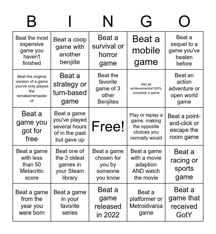 This bingo card has a free space and 24 words: Beat one of the 3 oldest games in your Steam library, Beat a game in your favorite series, Beat the favorite game of 3 other Benjiites, Beat a game from the year you were born, Beat a sequel to a game you've beaten before, Beat the most expensive game you haven't finished, Beat the original version of a game you've only played the remake/remaster of, Beat a coop game with another benjiite, Play or replay a game, making the opposite choices you normally would, Beat a game chosen for you by someone you know, Get all achievements/100% complete a game, Beat a game you got for free, Beat a game with a movie adaption AND watch the movie, Beat a racing or sports game, Beat a strategy or turn-based game, Beat a platformer or Metroidvania game, Beat a point-and-click or escape the room game, Beat a survival or horror game, Beat an action adventure or open world game, Beat a game you've played several hours of in the past but gave up, Beat a game that received GotY, Beat a game with less than 50 Metacritic score, Beat a mobile game and Beat a game released in 2022.