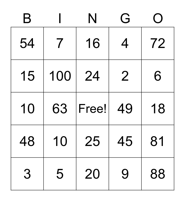This bingo card has a free space and 24 words: 10, 5, 24, 3, 72, 54, 15, 7, 49, 25, 2, 10, 45, 81, 100, 9, 18, 16, 6, 63, 88, 48, 4 and 20.