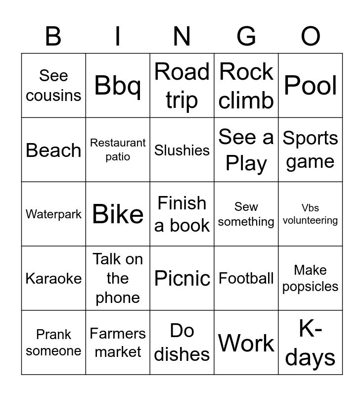 This bingo card has 76 words: Free!, Summer school, Road trip, Fort Edmonton, Make a sunday, Campfire, Zoo, Muttart, Hang with bunny, Camping, K-days, Street performers, Slushies, Beach, Skateboard or rollerskate, Bike, Suntan, Finish a book, Hike, Pool, Water fight, Waterpark, Restaurant patio, Bbq, Rock climb, Bannock, Photoshoot, Watch sunset/ sunrise, Movie night, Shopping, Theme dinner, Game night, Hot tub, Football, Sports game, See a Play, Dress fancy, Bowling, Vbs volunteering, Work, Heritage days, Shakespear play, Flower garden, Climb a tree, Water flowers, Hang with friends, Prank someone, See cousins, Eat sushi, Cook a new recipe, Play in rain, Picnic, Playground, Slip n slide, Craft, Paint, Flower crowns, Drive the car, Go to the movies, Paint nails, Talk on the phone, Hang with family, Celebrate birthday, Trampoline, Try new food, Mini golf, Sew something, Fruit picking, Chalk drawing, Hug 10 people, Make popsicles, Karaoke, Farmers market, Mow the lawn, Do dishes and Clean.