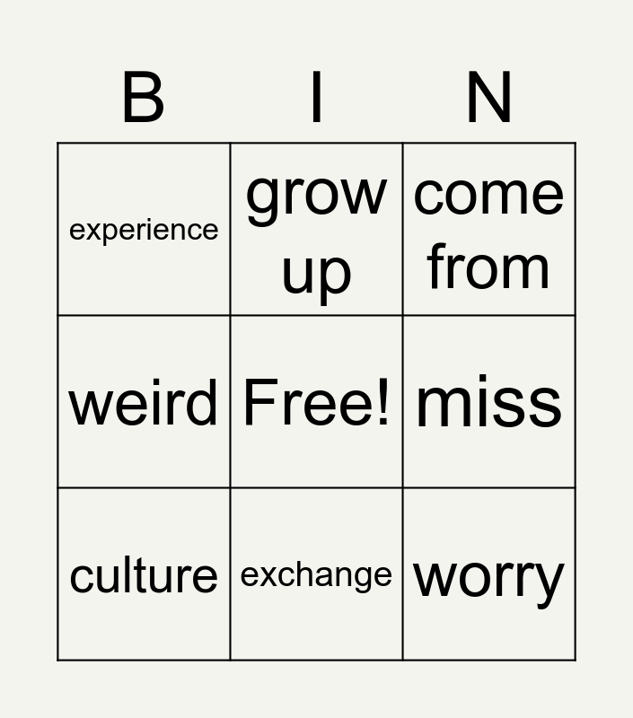 This bingo card has a free space and 8 words: miss, come from, grow up, culture, experience, worry, weird and exchange.