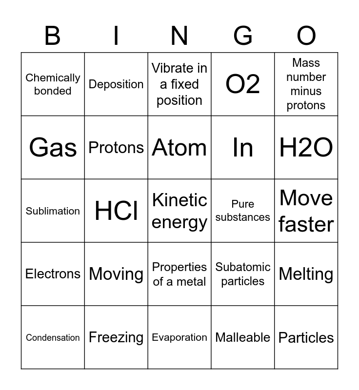 This bingo card has 36 words: Free!, Negative, Neutral, Protons, Subatomic particles, Electrons, Atom, Atomic Number, Mass number minus protons, HSO4, HCl, O2, Mixture, Pure substances, H2O, Chemically bonded, Particles, Moving, Kinetic energy, Vibrate in a fixed position, Move faster, Melting, Freezing, Condensation, Evaporation, Deposition, Sublimation, Pressure, In, Gas, Liquid, Solid, Malleable, Properties of a metal, Ductile and Properties of non-metals.