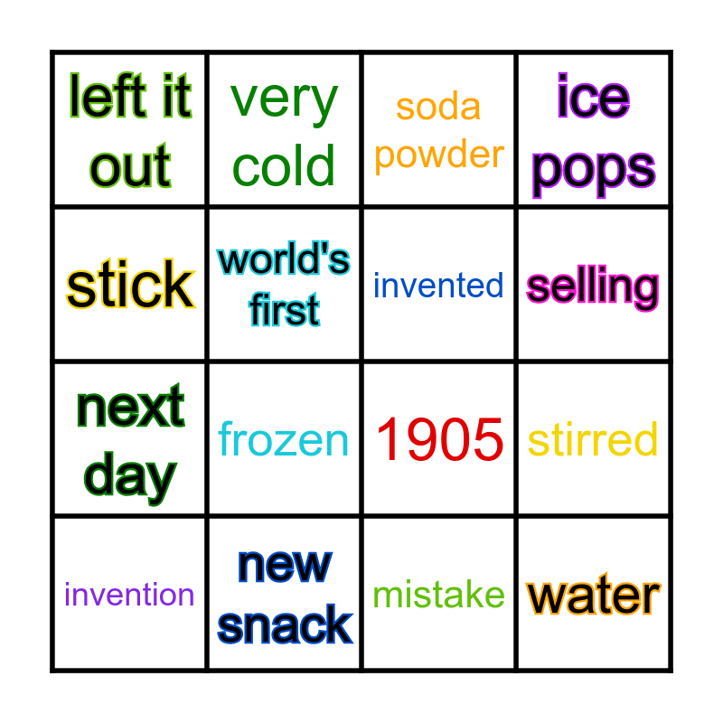 This bingo card has 19 words: 1905, Frank Epperson, soda powder, water, stirred, stick, mistake, left it out, very cold, next day, frozen, world's first, invented, new snack, invention, "Eppsicle", ice pops, selling and Popsicle.