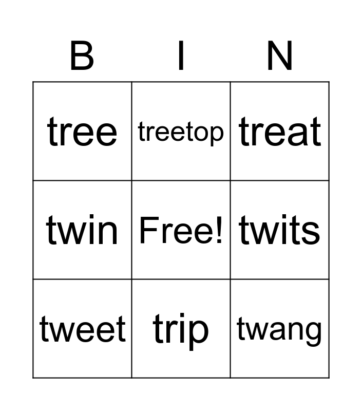 This bingo card has a free space and 14 words: trail, trick, tweet, treetop, twin, twang, train, twist, trip, tree, tweed, twits, treat and triffid.
