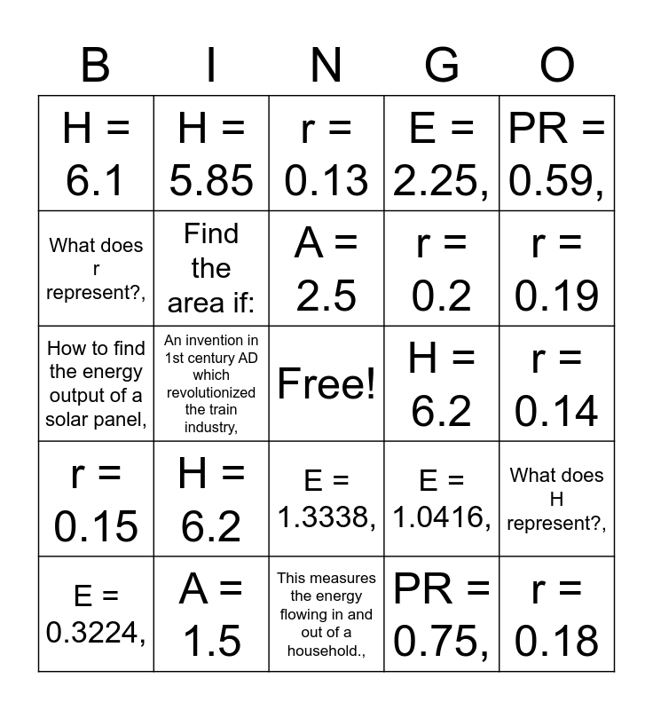This bingo card has a free space and 60 words: Find the energy output if:, A = 1.5, H = 5.7, r = 0.15, PR = 0.75,, What is the energy output measured in?,, Find the area if:, H = 6.25, r = 0.2, PR = 0.9, E = 2.25,, Will a solar panel always produce the same amount of energy year round?,, What does r represent?,, Find the energy output if:, A = 2.1, H = 6.1, r = 0.18, PR = 0.59,, Find the performance ratio if:, A = 2.5, H = 6.2, r = 0.13, E = 0.3224,, What does H represent?,, A solar panel’s energy output is 2.75. Find the energy output if the area is doubled.,, Find the energy output if:, A = 2.7, H = 6, r = 0.19, PR = 0.7,, What does burning wood produce?,, What is daily solar radiation measured in?,, the generation of current when light shines on an electrode, Find the energy output if:, A = 2.4, H = 5.85, r = 0.2, PR = 0.65,, An invention in 1st century AD which revolutionized the train industry,, This creates the electrical current from the sun’s energy.,, How to find the energy output of a solar panel,, Find the area of the solar panel if:, H = 6.2, r = 0.14, PR = 0.75, E = 1.0416,, Find the daily solar radiation (H) if:, A = 1.9, r = 0.18, PR = 0.60, E = 1.3338,, This measures the energy flowing in and out of a household.,, Find the energy output if:, A = 1.2, H = 6.3, r = 0.15, PR = 0.78,, An advantage of using solar power is…,, If PR = 0.75, what percent of energy is being lost due to performance issues?,, What started in 1760, and Name for the cells in the panels.