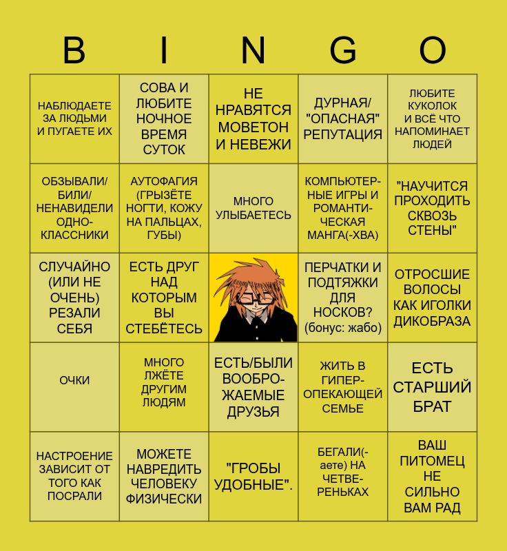 This bingo card has a free space and 24 words: НАСТРОЕНИЕ ЗАВИСИТ ОТ ТОГО КАК ПОСРАЛИ, МНОГО ЛЖЁТЕ ДРУГИМ ЛЮДЯМ, МНОГО УЛЫБАЕТЕСЬ, БЕГАЛИ(-аете) НА ЧЕТВЕ-РЕНЬКАХ, ЛЮБИТЕ КУКОЛОК И ВСЁ ЧТО НАПОМИНАЕТ ЛЮДЕЙ, НАБЛЮДАЕТЕ ЗА ЛЮДЬМИ И ПУГАЕТЕ ИХ, СОВА И ЛЮБИТЕ НОЧНОЕ ВРЕМЯ СУТОК, НЕ НРАВЯТСЯ МОВЕТОН И НЕВЕЖИ, ПЕРЧАТКИ И ПОДТЯЖКИ ДЛЯ НОСКОВ? (бонус: жабо), ОТРОСШИЕ ВОЛОСЫ КАК ИГОЛКИ ДИКОБРАЗА, СЛУЧАЙНО (ИЛИ НЕ ОЧЕНЬ) РЕЗАЛИ СЕБЯ, АУТОФАГИЯ (ГРЫЗЁТЕ НОГТИ, КОЖУ НА ПАЛЬЦАХ, ГУБЫ), ЖИТЬ В ГИПЕР-ОПЕКАЮЩЕЙ СЕМЬЕ, ЕСТЬ СТАРШИЙ БРАТ, ОБЗЫВАЛИ/БИЛИ/НЕНАВИДЕЛИ ОДНО-КЛАССНИКИ, МОЖЕТЕ НАВРЕДИТЬ ЧЕЛОВЕКУ ФИЗИЧЕСКИ, "ГРОБЫ УДОБНЫЕ"., ДУРНАЯ/ "ОПАСНАЯ" РЕПУТАЦИЯ, "НАУЧИТСЯ ПРОХОДИТЬ СКВОЗЬ СТЕНЫ", ОЧКИ, ЕСТЬ ДРУГ НАД КОТОРЫМ ВЫ СТЕБЁТЕСЬ, ЕСТЬ/БЫЛИ ВООБРО-ЖАЕМЫЕ ДРУЗЬЯ, КОМПЬЮТЕР- НЫЕ ИГРЫ И РОМАНТИ- ЧЕСКАЯ МАНГА(-ХВА) and ВАШ ПИТОМЕЦ НЕ СИЛЬНО ВАМ РАД.