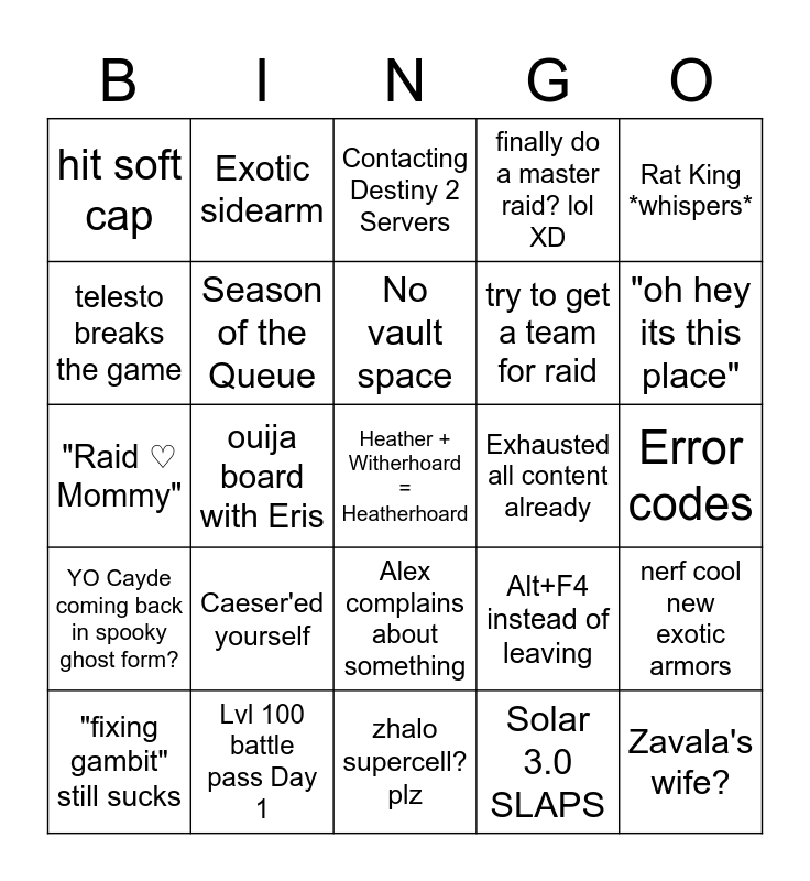 This bingo card has a free space and 24 words: Caeser'ed yourself, Lvl 100 battle pass Day 1, No vault space, "fixing gambit" still sucks, Rat King *whispers*, hit soft cap, telesto breaks the game, Exotic sidearm, Exhausted all content already, Alex complains about something, try to get a team for raid, "Raid ♡ Mommy", Alt+F4 instead of leaving, nerf cool new exotic armors, Season of the Queue, Solar 3.0 SLAPS, Error codes, Contacting Destiny 2 Servers, "oh hey its this place", ouija board with Eris, Zavala's wife?, YO Cayde coming back in spooky ghost form?, finally do a master raid? lol XD and zhalo supercell? plz.