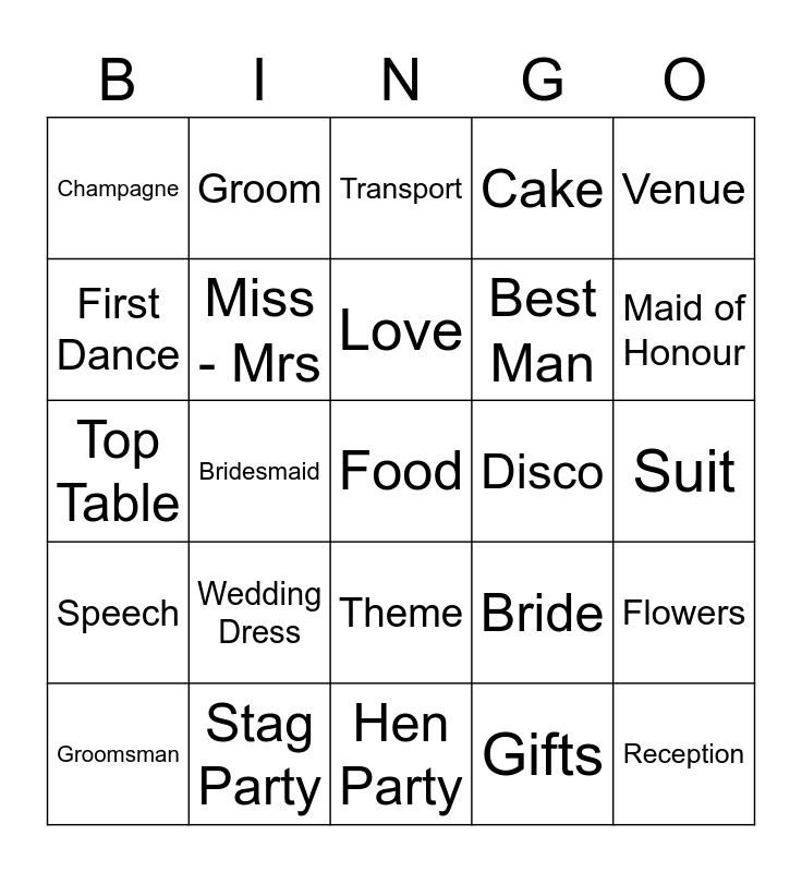 This bingo card has a free space and 24 words: Wedding Dress, Stag Party, Love, Groomsman, Venue, Champagne, First Dance, Groom, Disco, Theme, Best Man, Top Table, Bride, Flowers, Miss - Mrs, Gifts, Suit, Transport, Maid of Honour, Bridesmaid, Reception, Speech, Cake and Hen Party.