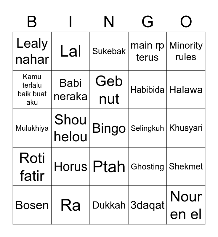 This bingo card has a free space and 24 words: Horus, Ra, Geb nut, Bosen, Minority rules, Lealy nahar, Kamu terlalu baik buat aku, Lal, Selingkuh, Ptah, Habibida, Mulukhiya, Ghosting, Shekmet, Babi neraka, 3daqat, Khusyari, Sukebak, Halawa, Shou helou, Nour en el, Roti fatir, main rp terus and Dukkah.