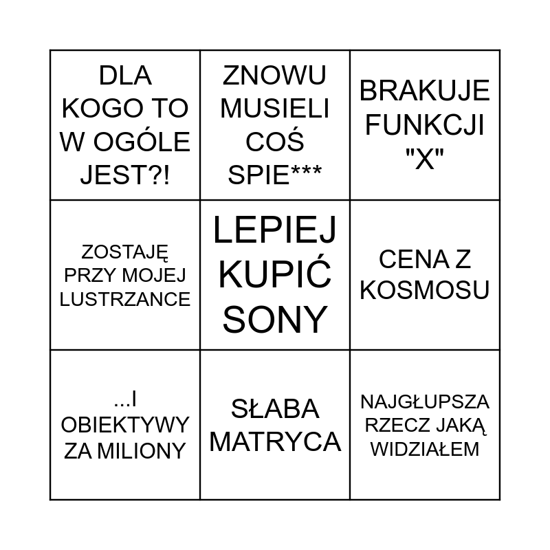 This bingo card has a free space and 8 words: CENA Z KOSMOSU, BRAKUJE FUNKCJI "X", ZNOWU MUSIELI COŚ SPIE***, ...I OBIEKTYWY ZA MILIONY, DLA KOGO TO W OGÓLE JEST?!, NAJGŁUPSZA RZECZ JAKĄ WIDZIAŁEM, ZOSTAJĘ PRZY MOJEJ LUSTRZANCE and SŁABA MATRYCA.