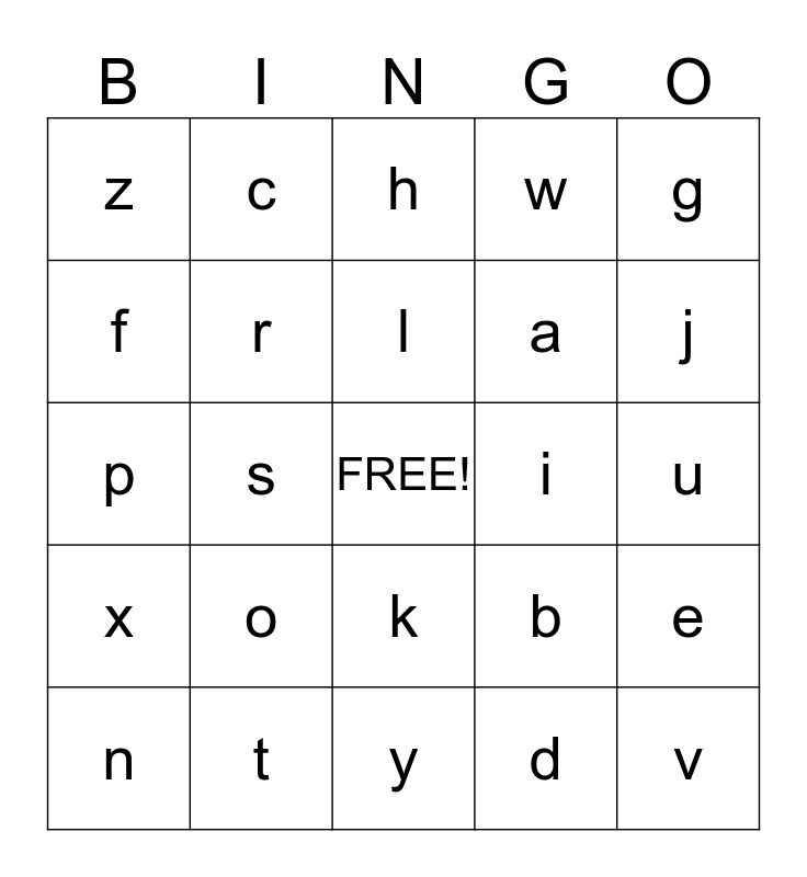 This bingo card has a free space and 24 words: o, t, l, n, g, z, f, c, i, k, a, p, b, e, r, d, u, h, j, s, v, x, w and y.