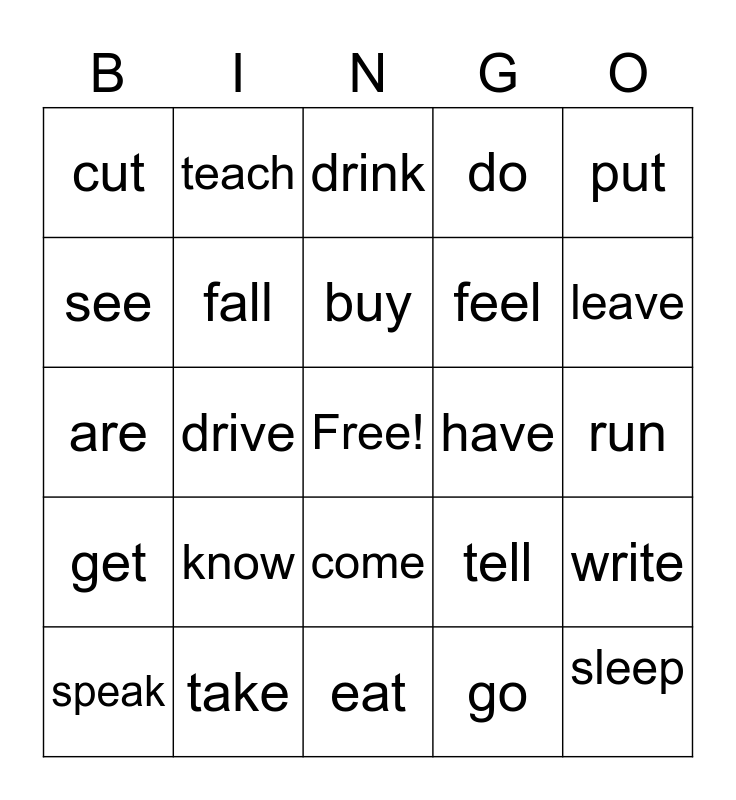 This bingo card has a free space and 24 words: know, take, buy, speak, put, cut, see, teach, have, come, feel, are, tell, write, fall, go, run, drink, leave, drive, sleep, get, do and eat.