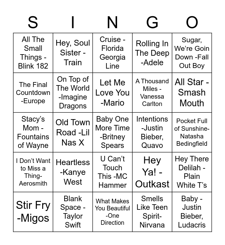 This bingo card has a free space and 71 words: Free!, Hey, Soul Sister -Train, Call Me Maybe -Carly Rae Jepsen, Grenade -Bruno Mars, What Makes You Beautiful -One Direction, Fireflies -Owl City, Rolling In The Deep -Adele, I Want It That Way -Backstreet Boys, A Thousand Miles -Vanessa Carlton, Forever -Chris Brown, Stir Fry -Migos, Wait -Maroon 5, All Star -Smash Mouth, All The Small Things -Blink 182, Jumpin’ Jumpin’ -Destiny’s Child, Stacy’s Mom -Fountains of Wayne, Hey Ya! -Outkast, Sugar, We’re Goin Down -Fall Out Boy, With You -Chris Brown, Pocket Full of Sunshine- Natasha Bedingfield, Heartless -Kanye West, Baby -Justin Bieber, Ludacris, Hey There Delilah -Plain White T’s, Story of My Life -One Direction, Bohemian Rhapsody -Queen, Don’t Stop Me Now- Queen, Any Way You Want It - Journey, (I Can’t Get No) Satisfaction -The Rolling Stones, Fortunate Son -Creedence Clearwater Revival, Thriller -Michael Jackson, Blank Space -Taylor Swift, September -Earth, Wind & Fire, Mr. Brightside -The Killers, Californication -Red Hot Chili Peppers, Smells Like Teen Spirit- Nirvana, Livin’ On A Prayer- Bon Jovi, Sunflower -Post Malone, Swae Lee, Here Comes The Sun -The Beatles, The Final Countdown -Europe, Don’t Stop Believin’ -Journey, U Can’t Touch This -MC Hammer, Ice Ice Baby -Vanilla Ice, I Don’t Want to Miss a Thing- Aerosmith, Sweet Home Alabama -Lynyrd Skynyrd, Born In the USA- Bruce Springsteen, Life is a Highway -Rascal Flatts, Ring of Fire -Johnny Cash, On Top of The World -Imagine Dragons, Black Dog -Led Zeppelin, Hit Me With Your Best Shot -Pat Benatar, It’s Still Rock and Roll to Me -Billy Joel, Take Me Home, Country Roads -John Denver, Intentions -Justin Bieber, Quavo, Ms. Jackson -Outkast, What are you so afraid of -XXXtentacion, Always Be My Baby -Mariah Carey, Let Me Love You -Mario, Fake Love -Drake, Shoop -Salt N Pepa, Crank That -Soulja Boy, Mood -24kGoldn, iann dior, Rolex -Ayo & Teo, Old Town Road -Lil Nas X, As It Was -Harry Styles, Heat Waves -Glass Animals, Tiny Dancer -Elton John, Cruise -Florida Georgia Line, Billie Jean -Michael Jackson, Kiss -Prince, Africa -TOTO and Bananza -Akon.