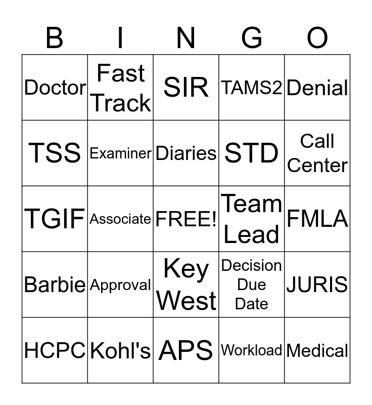 This bingo card has a free space and 24 words: Approval, Kohl's, Diaries, HCPC, Denial, Doctor, TSS, Fast Track, Team Lead, Key West, STD, TGIF, Decision Due Date, JURIS, Examiner, Workload, FMLA, SIR, Call Center, Associate, Medical, Barbie, TAMS2 and APS.