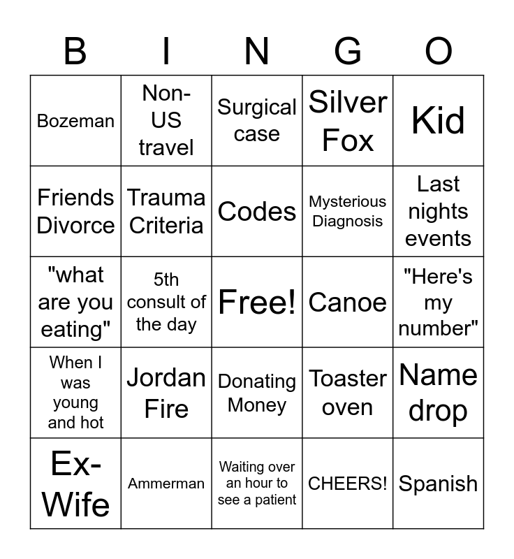 This bingo card has a free space and 24 words: Jordan Fire, Ammerman, Codes, Ex-Wife, Kid, Bozeman, Friends Divorce, Non-US travel, Canoe, Donating Money, Mysterious Diagnosis, "what are you eating", Toaster oven, Name drop, Trauma Criteria, CHEERS!, "Here's my number", Surgical case, Last nights events, 5th consult of the day, Spanish, When I was young and hot, Silver Fox and Waiting over an hour to see a patient.