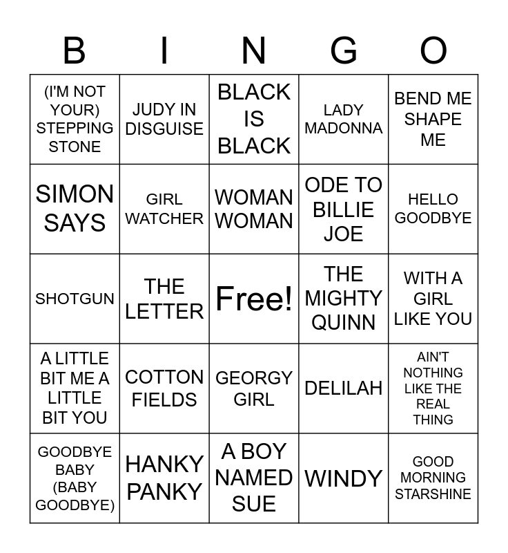 This bingo card has a free space and 47 words: SPINNING WHEEL, GOOD MORNING STARSHINE, MORE TODAY THAN YESTERDAY, A BOY NAMED SUE, COTTON FIELDS, CRY LIKE A BABY, JUDY IN DISGUISE, THOSE WERE THE DAYS, SIMON SAYS, YUMMY YUMMY, GIRL WATCHER, LADY MADONNA, AIN'T NOTHING LIKE THE REAL THING, DELILAH, NOBODY BUT ME, THE UNICORN, WOMAN WOMAN, THE MIGHTY QUINN, SUZIE Q, BEND ME SHAPE ME, THE LETTER, WINDY, (I'M NOT YOUR) STEPPING STONE, ODE TO BILLIE JOE, GIMME LITTLE SIGN, HELLO GOODBYE, GOODBYE BABY (BABY GOODBYE), UP UP AND AWAY, GEORGY GIRL, A LITTLE BIT ME A LITTLE BIT YOU, LET'S LIVE FOR TODAY, TELL IT LIKE IT IS, WHEN I'M SIXTY-FOUR, MELLOW YELLOW, SECRET AGENT MAN, HANKY PANKY, WITH A GIRL LIKE YOU, BAREFOOTIN', LIL RED RIDING HOOD, BUS STOP, UNDER MY THUMB, BLACK IS BLACK, SHOTGUN, THE IN CROWD, GIMME GIMME GOOD LOVIN', BREAD & BUTTER and A WORKD WITHOUT LOVE.