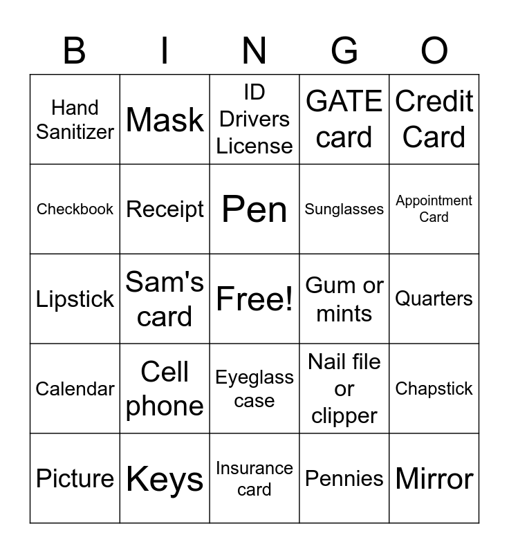 This bingo card has a free space and 24 words: Cell phone, Keys, Pen, Picture, Credit Card, Hand Sanitizer, Checkbook, Mask, Gum or mints, Eyeglass case, Sunglasses, Lipstick, Nail file or clipper, Chapstick, Receipt, Pennies, Quarters, ID Drivers License, Appointment Card, Sam's card, Mirror, Calendar, GATE card and Insurance card.