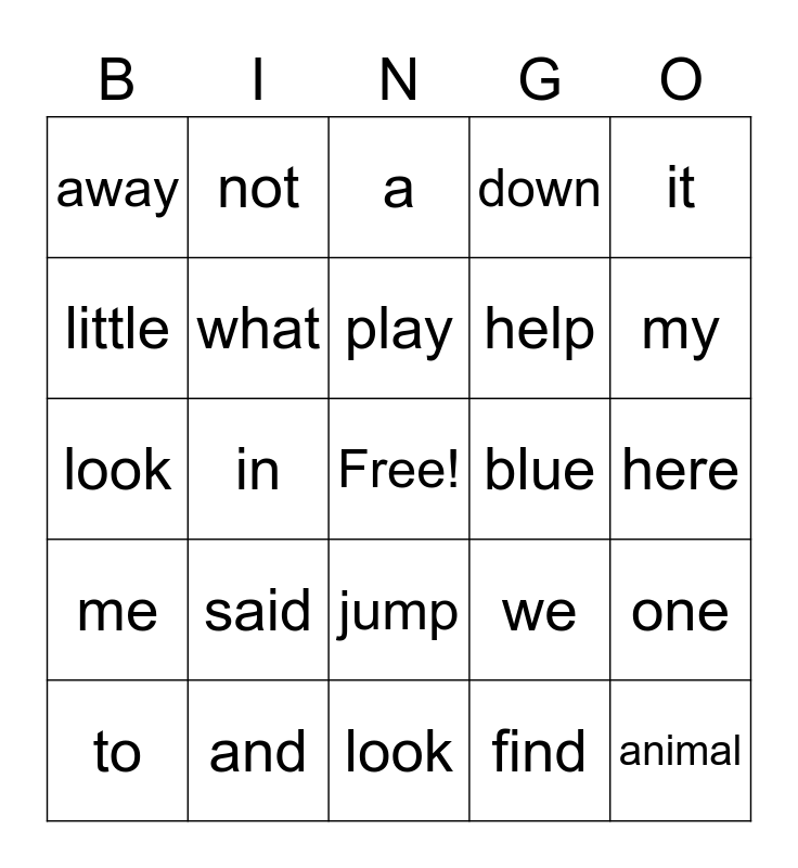 This bingo card has a free space and 29 words: the, and, a, is, it, away, what, play, blue, one, to, in, find, animal, look, can, look, we, my, me, said, you, help, here, little, not, jump, down and come.