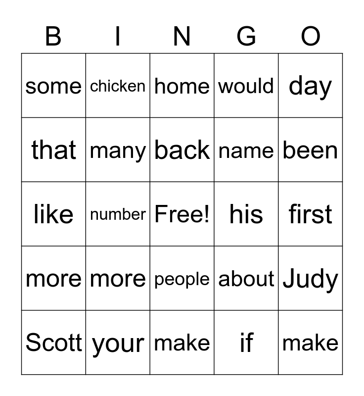 This bingo card has a free space and 35 words: with, time, be, many, people, would, that, from, back, as, like, day, word, how, some, his, if, number, more, make, about, Scott, Judy, your, home, been, right, end, name, first, men, make, more, chicken and picture.