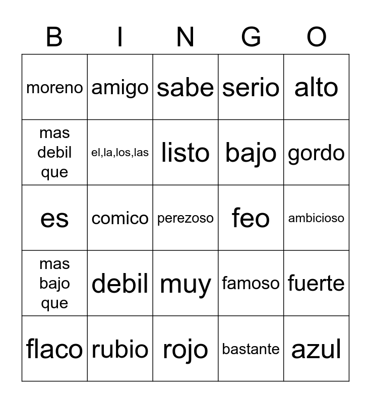 This bingo card has 38 words: chico, chica, estudiante, el,la,los,las, fuerte, debil, listo, tonto, alto, bajo, comico, serio, perezoso, ambicioso, mas debil que, mas bajo que, escuela, sabe, guapo, feo, moreno, rubio, gordo, flaco, verde, rojo, azul, amarillo, blanco, negro, ella, muy, bastante, amigo, rico, famoso, es and mas.
